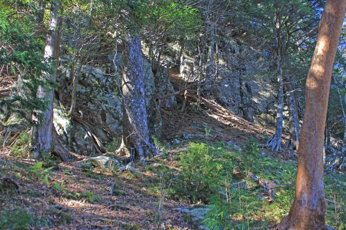| 下り始めてみれば思いのほか木の根などの足掛かりが多く、短時間で無事に下ることができました。 途中で右に下降の方向が変わるところは少し振られてヒヤッとしました。 写真は下って来た方を振り返ったもの。中央の岩と岩の間から下ってきました。 |