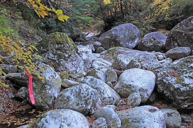 | 巨岩ゴロゴロの河原を進んで行きます。歩きにくい。 |