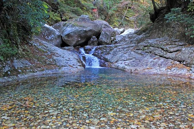 | 滝壺です。水量が少ないのと滝の水が直接落ちないためか意外と穏やかです。 |