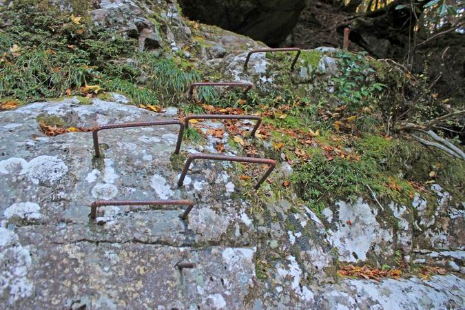 | 垢離取場から岩に打たれた鉄筋の階段を登る。 登りはともかく帰りの下りでは慎重さが要求されたところでした。 |