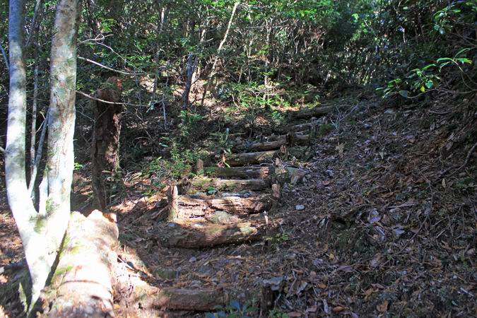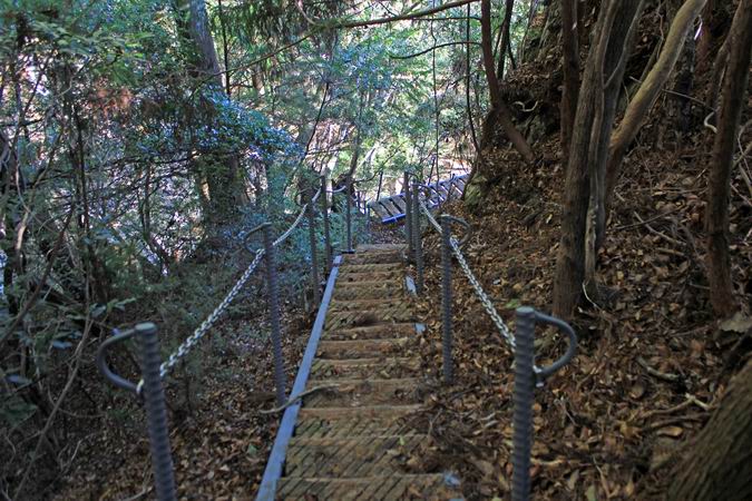 | 二ツ岩から先は巻き道になる。鎖場などもある道を進んで行くと再び階段混じりの道となる。 |