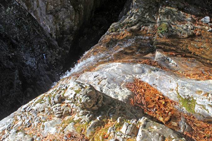| 千手滝の近くまで下りてきました。これは三重滝の最下段の不動滝の落口です。 あまり際まで行かないように。 |