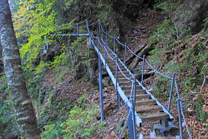 | 登り切ったあとは鉄の階段で急降下です。 ここは地図を見ても崖地のようで、よくこんなところに道を造ったものだと思います。 この設備ができる前はどのようにして滝まで行ったのだろう。 |