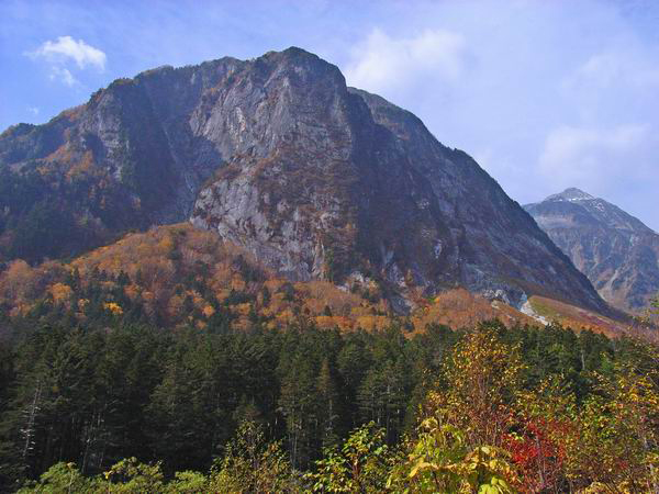 本谷橋手前から紅葉の横尾谷と北穂高を見る。
