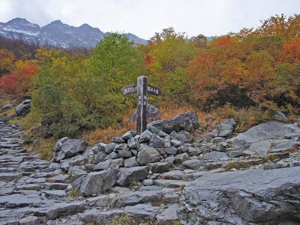 再び明神館に戻って涸沢を目指す。5分ほどで徳本峠への道との分岐点を通過。