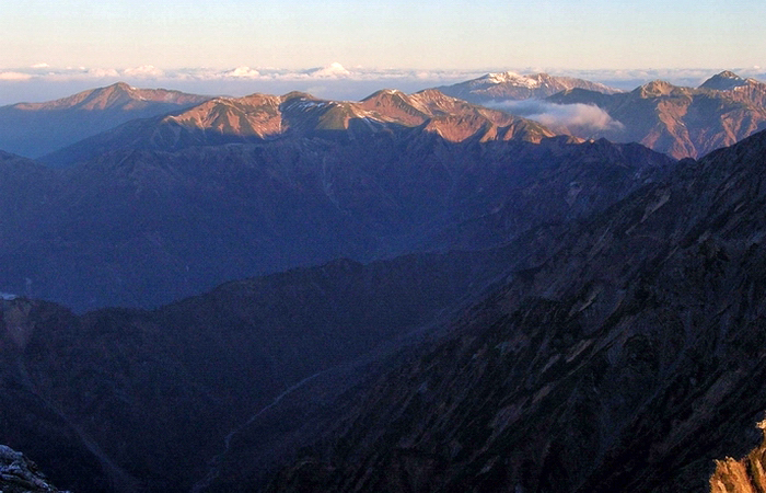 午前6時ごろに北穂高岳でご来光を迎える(手前は常念山脈)。