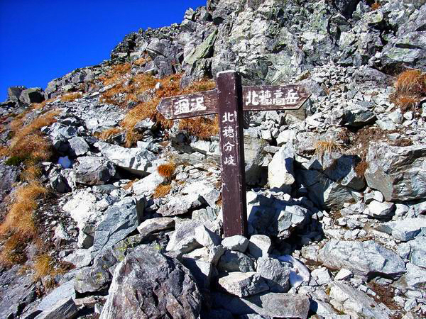 道を右に取り、南峰を巻いて頭上に覆い被さるような大岩の下を通って一登りすると北穂高岳の山頂に出た。午後2時50分着。
