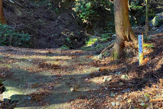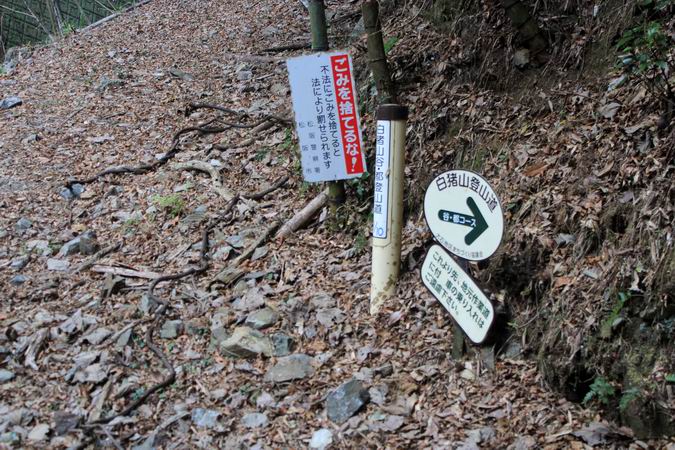 | 午前11時30分に登山口に到着。1/10の道標がある。ここで右折。 写真では分からないがこの先もかなりの急坂。 |