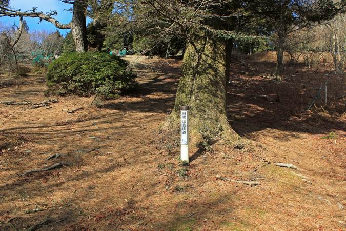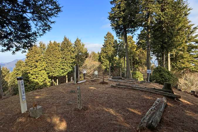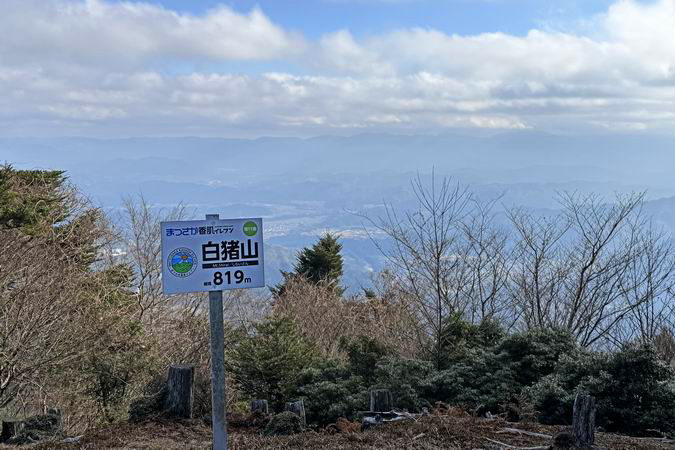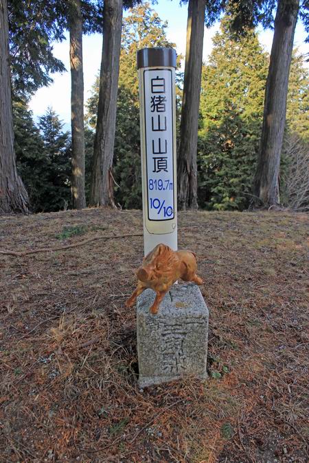 | 午後1時55分に白猪山山頂に到着。山名板や道標が賑やかに立ち並んでいます。 |
