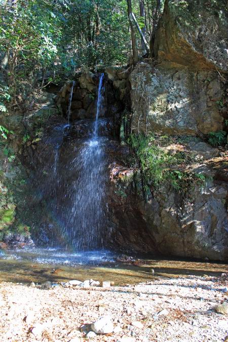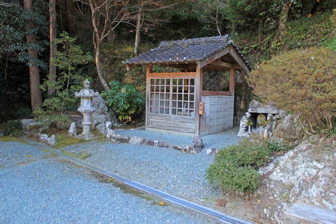 | 10分ほど行くと大日堂・庚申堂がありました。ここにも奥に滝があります。 大日堂は牛の供養のため、庚申堂は疫病防止のためらしい。 |