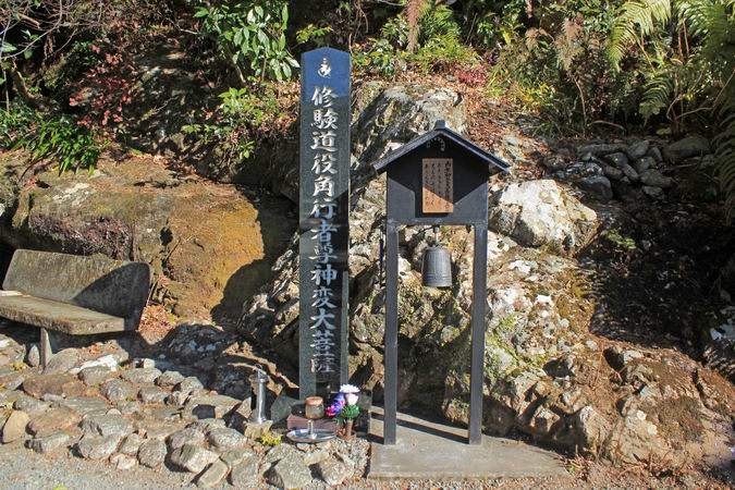 | 不動滝の右に役行者の石碑があるが行者像はどこに? あたりをキョロキョロ見回すと・・・ |