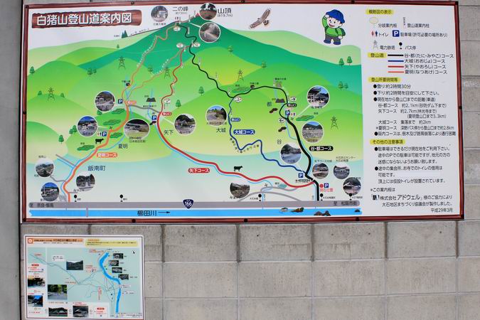 | 駐車場の入口にあった案内図。白猪山登山道のメインルートは夏明コース。 なお、烏岳のメインルートは私が登ったコースとは反対側の茶倉からの立梅ルート。 (画像をクリックすると拡大されます) |
