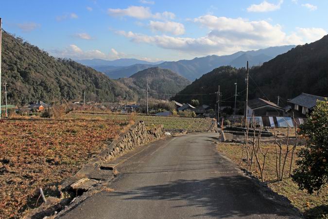 | 進むにつれて益々急になってきた車道を歩いてようやく山の中に入ってきました。 |