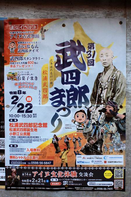 | 大日堂まで戻って来ると、近くにある掲示板のポスターが目についた。 武四郎とはもしやと思って見ると、やはり松浦武四郎だった。松阪の人だったことを思い出しました。 北海道の名付け親で名高いが、晩年に大台ヶ原周辺を探検したことも印象深い。 |
