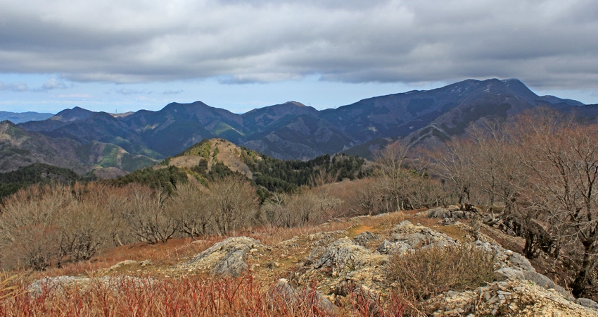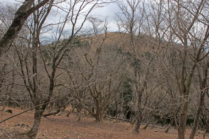 | 本峰に戻ってから先に進みます。 木々に遮られてスッキリとした眺めはないが、葉を落とした枝を透かしてまわりの山の様子は分かります。 右からザラノ、御池岳、焼尾山、三国山が見えています。 |